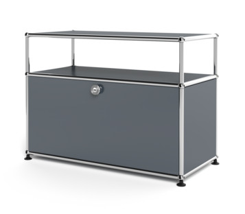 Meuble bas Lowboard M USM Haller avec rehausse, personnalisable, Gris moyen RAL 7005, Avec porte abattante, Avec passe-câbles au centre bas