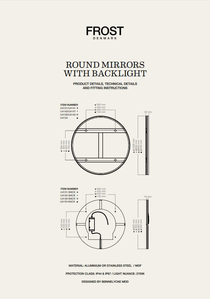 | Accessoires | Tous les miroirs ronds et miroirs ovales peuvent être équipés d'un panneau arrière LED. Veuillez impérativement tenir compte de notre remarque concernant la compatibilité |