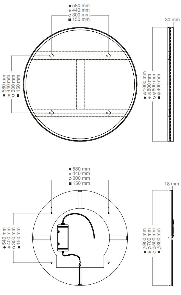 | Dimensions | ![]() Exemple de dimensions pour les modèles ronds |