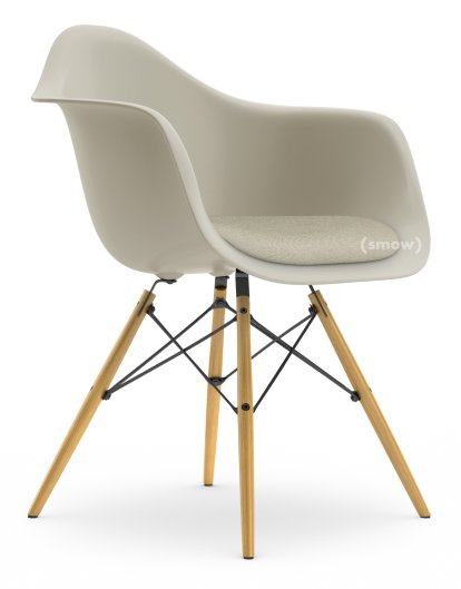 En utilisant des procédés de fabrications et des matériaux nouveaux, Charles et Ray Eames révolutionnèrent plus d’une fois l’histoire du mobilier. Ce fut le cas notamment avec les plastic chairs, qui furent conçues en 1948 à l’occasion du concours organisé par le Museum of Modern Art de New York : "International Competition for Low Cost Furniture". Avec leurs chaises dont l’assise est constituée d’un seul bloc en résine de polyester renforcée de fibre de verre, les Eames remportèrent la deuxième place. Ce matériau présentait de nombreux avantages parmi lesquels sa souplesse, son prix abordable et la possibilité de produire les chaises en grandes séries, ce qui répondait tout à fait aux besoins de l’Amérique des années 1950. En plus du fauteuil DAW, Charles et Ray Eames créèrent bien d’autres chaises en plastique adaptées à diverses situations grâce à différents types d’assises et de piètements. On les retrouve d’ailleurs aujourd’hui dans de nombreux musées et dans un nombre incalculable de foyers. Pour ce qui est du Eames DAW, il s’agit d’un fauteuil confortable avec des pieds en érable. Charles et Ray Eames décrivaient l'un de leurs objectifs primordiaux en tant que créateurs de mobilier comme suit : « Rendre le meilleur accessible au plus grand nombre ». Parmi leurs créations, aucune autre ne semble leur avoir permis de s'approcher autant de cet idéal que le fauteuil DAW.