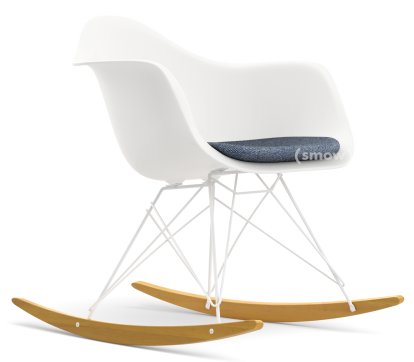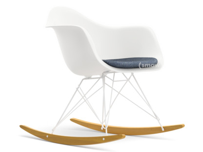 Eames Plastic Armchair RE RAR avec rembourrage, Blanc non-RE, Avec coussin d'assise, Bleu foncé / ivoire, Sans passepoile, Blanc/érable nuance de jaune