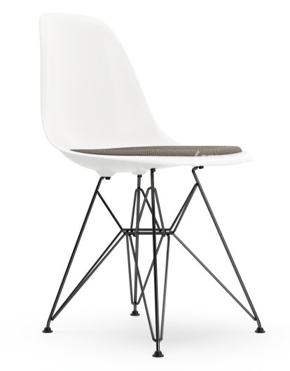 Eames Plastic Side Chair RE DSR Blanc non-RE|Avec coussin d'assise|Gris chaud / marron marais|Version standard - 43 cm|Revêtement basic dark