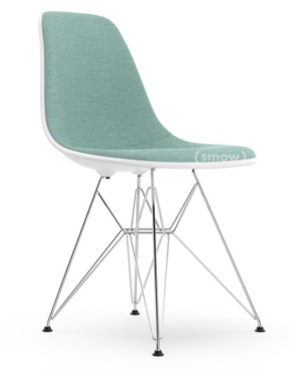 Eames Plastic Side Chair RE DSR, Blanc non-RE, Rembourrage intégral, Bleu glacier / ivoire, Version standard - 43 cm, Chromé