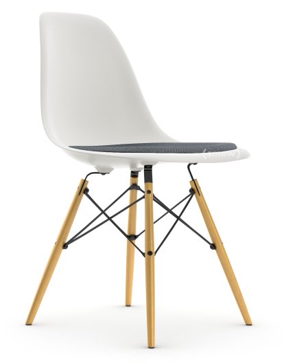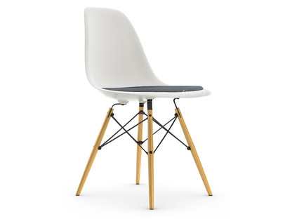 Eames Plastic Side Chair RE DSW, Blanc non-RE, Avec coussin d'assise, Bleu foncé / ivoire, Version standard - 43 cm, Frêne tons miel