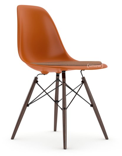 Eames Plastic Side Chair RE DSW, Orange rouille, Avec coussin d'assise, Cognac / ivoire, Version standard - 43 cm, Érable foncé