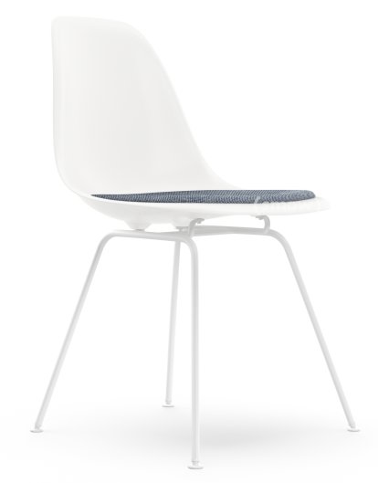 Eames Plastic Side Chair RE DSX, Blanc non-RE, Avec coussin d'assise, Bleu foncé / ivoire, Version standard - 43 cm, Revêtement blanc