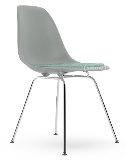 Eames Plastic Side Chair RE DSX, Gris clair, Avec coussin d'assise, Bleu glacier / ivoire, Version standard - 43 cm, Chromé