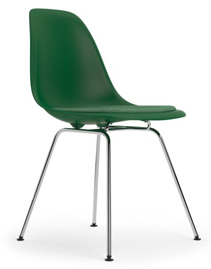 Eames Plastic Side Chair RE DSX, Vert émeraude, Avec coussin d'assise, Vert / ivoire, Version standard - 43 cm, Chromé