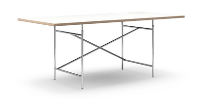 Table Eiermann, Mélaminé blanc avec bords chêne, 200 x 90 cm, Chromé, Oblique, décalé (Eiermann 1), 110 x 66 cm