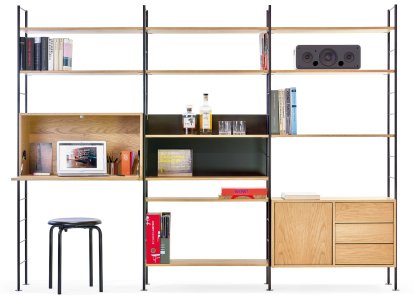 | Matériaux | Echelle : tube d'acier (16 mm) et fil métallique (6 mm), peints par poudrage Panneau arrière : MDF (8 mm), laqué Étagères : bouleau multiplex (16 mm) avec placage chêne, laqué Éléments d'armoire : MDF (16 mm) laqué noir à pores ouverts (RAL 9005) ou plaqué chêne, laqué incolore |