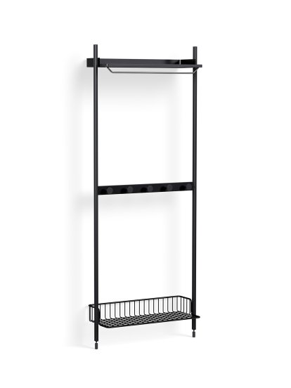 | Matériaux | Étagères : tôle d'acier, poudrée en noir Suspension de la barre : acier chromé Tringle de vestiaire : aluminium extrudé avec boutons en aluminium moulé sous pression Panier en fil métallique : tige et fil d'acier, revêtement époxy noir Armoire : tôle d'acier, revêtement époxy noir avec porte en aluminium à fermeture magnétique Connecteurs : aluminium Colonnes : aluminium anodisé noir avec surface satinée et embout/patins en plastique |