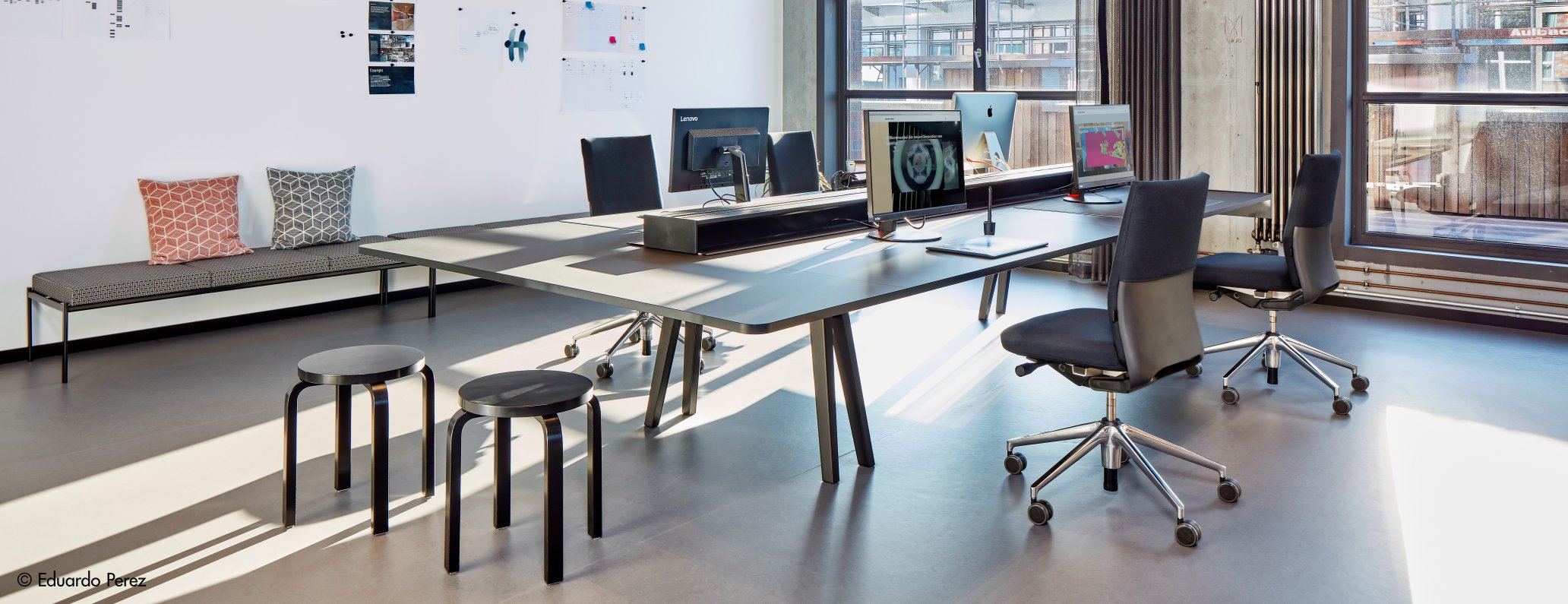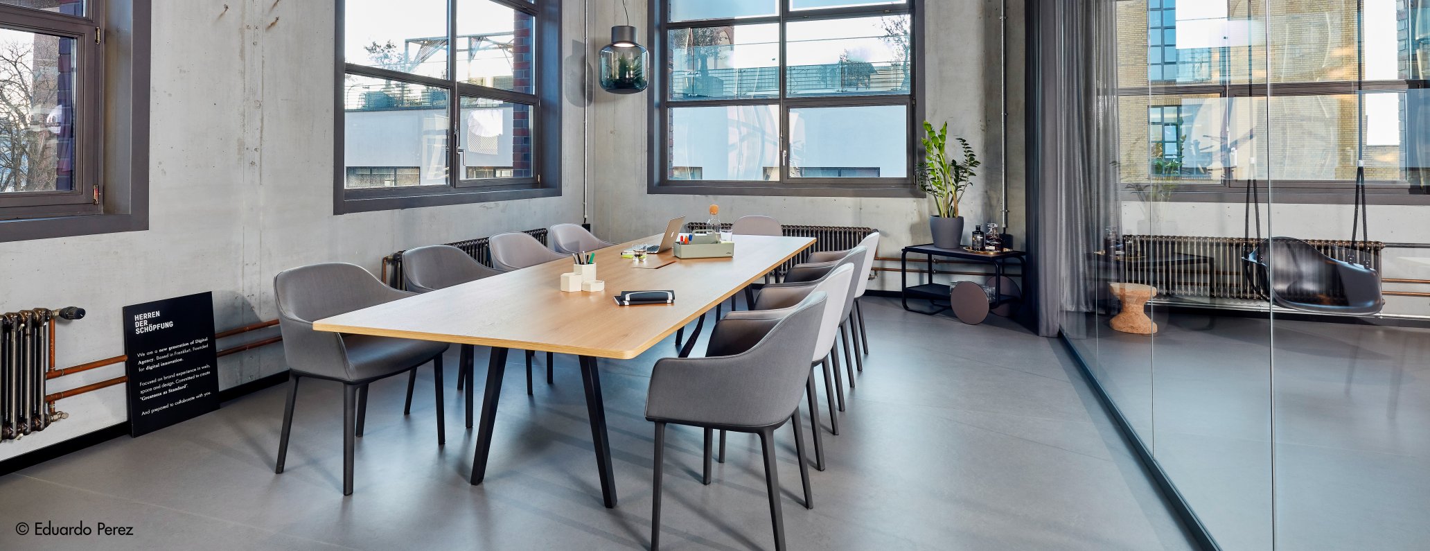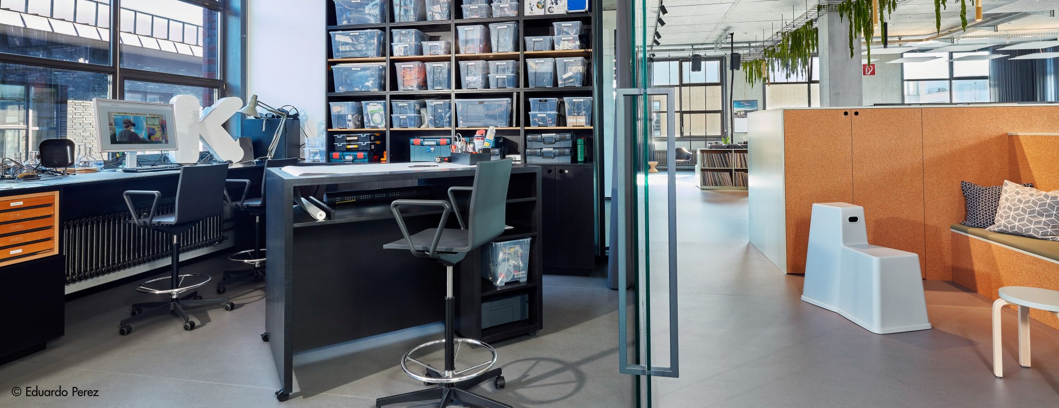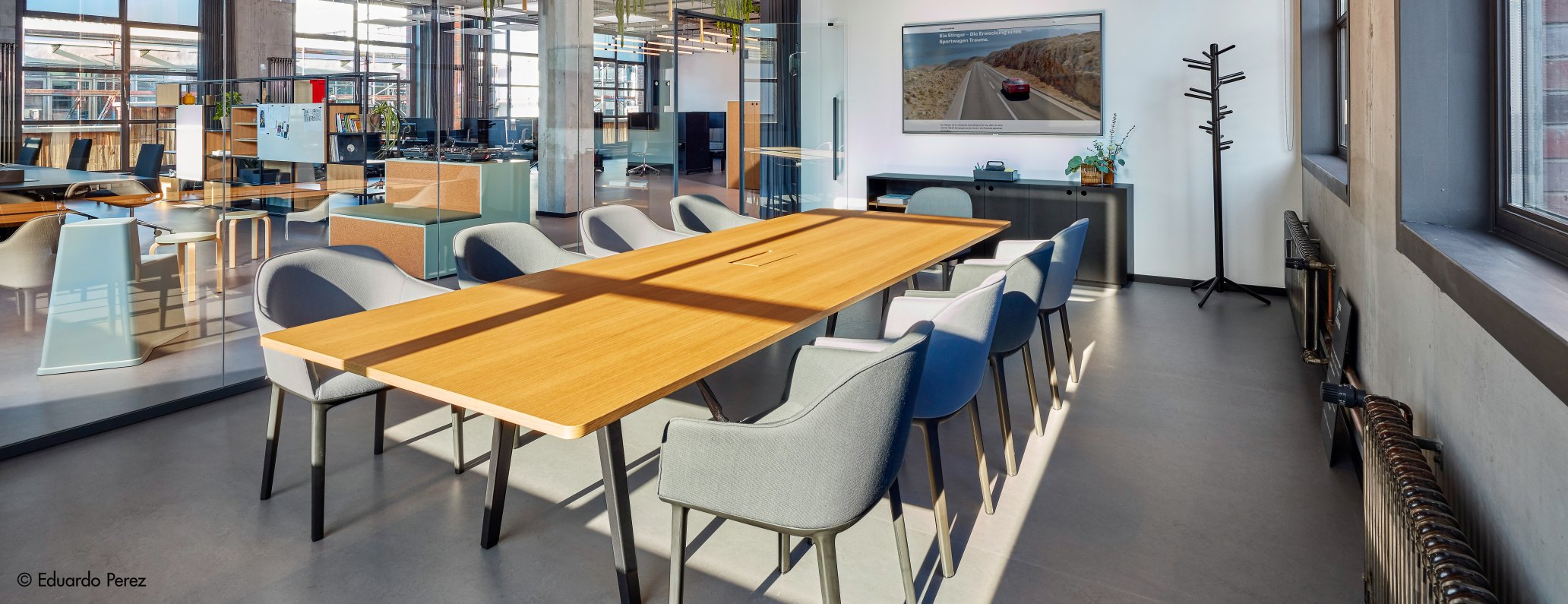 Lors workshops stratégiques avec Vitra et smow, les besoins ont été définis et un concept d'espace adapté a été développé en tenant compte des différents types de travail et des flux de travail des agences. Un concept de couleurs, d'acoustique et d'éclairage adapté aux employés de la création complétait l'ameublement approprié pour les postes de travail, les points de rencontre et les laboratoires multimédia. Les espaces, flexibles, peuvent s'adapter à la croissance future de l'entreprise, mais peuvent déjà être utilisés aujourd'hui comme espace de travail en commun et partagé.