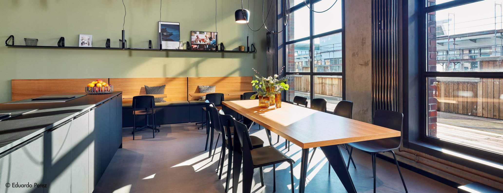 Dans un ancien hôpital de la garnison, quatre étages d'espaces de travail flexibles sont à disposition pour les employés, au milieu des surfaces d'exposition mises en scène avec soin.