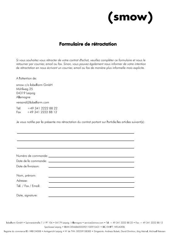 Si vous souhaitez annuler votre commande sur la boutique en ligne smow, veuillez nous retourner le formulaire complété par e-mail, courrier ou fax. Alternativement, une objection informelle, clairement formulée avec le numéro de commande peut être envoyée par e-mail en réponse à la confirmation de commande.