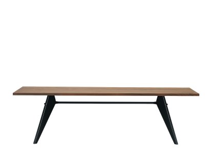 La table EM, dessinée par Jean Prouvé au début des années 1950 dans le cadre du projet "Maison Tropique", est actuellement éditée par le fabricant de meubles suisse Vitra. La particularité esthétique réside dans le piètement. Effectivement, les quatre pieds de la table sont reliés par une traverse et sont inclinés en diagonal. Cela apporte une extrême stabilité et un charme indéniable. De plus, le plateau de table est disponible en cinq tailles et s'adapte ainsi parfaitement aux différentes grandeurs de pièces ou de coupes.
