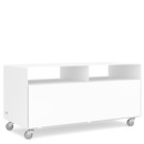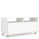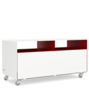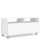 | Fonctions & Propriétés | Soudé à la main à partir d'une tôle d'acier de 2,5 mm d'épaisseur Avec porte battante et 2 compartiments de rangement Passe-câbles au verso du meuble: H 4 cm Position au passe-câbles: en bas sur toute la largeur Roulettes industrielles et transparentes, chacune avec freins à l'arrière Poids max. jusqu'à 50 kg |