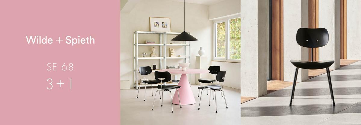 La chaise SE 68 d'Egon Eiermann pour Wilde + Spieth est considérée comme une icône du modernisme d'après-guerre : claire et élégante dans sa forme, elle convient à un usage quotidien. Jusqu'au 21 décembre 2025, pour l'achat de 4 chaises SE 68 identiques en hêtre laqué noir ou en chêne naturel, la quatrième chaise est offerte.Il vous suffit d'ajouter les quatre chaises à votre panier et la réduction de 25 % s'affichera immédiatement.*