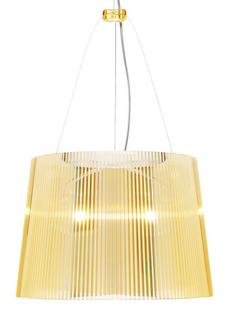 La suspension Gè est une des nombreuses lampes design conçues par Ferruccio Laviani pour Kartell. Bien qu’elle soit constituée d’un abat-jour assez classique, elle resplendit et se distingue par ses matériaux constitutifs comme une lampe extravagente. En polycarbonate transparent ou coloré, avec sa surface plissée, Gè enchantera la pièce d’un effet lumineux subtil et par son design moderne et discret. Dans les versions aux couleurs métalliques et à l’intérieur miroir, elle brille encore davantage et ne passe pas inaperçue. Une rosace de plafond assortie aux plissures de l’abat-jour vient parfaire cette création. Celle-ci est constitue d’ailleurs un clin d’œil à sa petite sœur : la lampe È, créée elle aussi par Ferruccio Laviani pour Kartell.