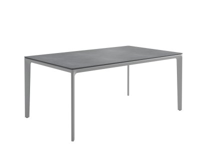 La table Carver de Gloster imaginée par le designer Hendrik Pedersen possède un piètement en aluminium dont les angles sont sculptés. L'allure générale est légère, accueillante et chic que le piètement soit associé au plateau de table en céramique grise ou en teck brun.