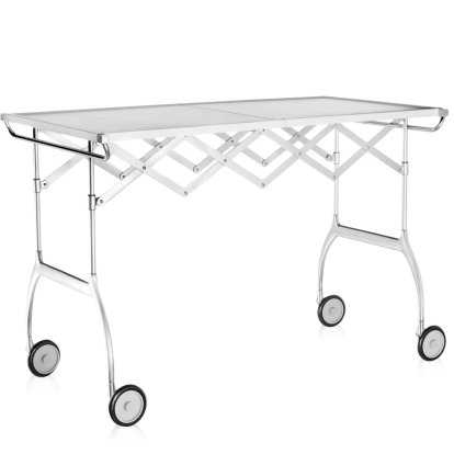 Le chariot de bar Battista a été conçu en 1991 par Antonio Citterio en collaboration avec Oliver Löw. L'objet, de par son design, c'est-à-dire son esthétique et ses matériaux, est caractéristique du fabricant Kartell. Le fabricant italien est connu pour son penchant pour la matière plastique, qui est représentée par le plateau du Battista offrant une combinaison des plus modernes avec la structure métallique. La desserte est très flexible, parce qu'elle possède des roues pour plus de mobilité et parce que prend extrêmement peu de place au rangement. Effectivement, son système en accordéon permet de rétracter le chariot et d'abaisser le plateau à la verticale. Ce petit meuble très résistant sera l'assistant idéal pour servir et servir vos convives de la salle à manger, en passant par le jardin et le salon.