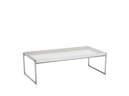 Un système articulé d’étagères pour la maison ou le bureau. Le concept de base de ce projet repose sur la déclinaison de petites tables et d'étagères dont les plateaux rappellent, par leur design et leurs finitions, les plateaux laqués japonais. Les plateaux, réalisés en raffiné méthacrylate plein, noir et blanc brillant, sont proposés dans trois tailles standards et fixés sur des structures de hauteurs variées, fixes ou sur roulettes.La ligne de la collection donne une idée de légèreté et d'élégance tout en garantissant la stabilité et la résistance des produits. Les tables sont disponibles dans deux versions rectangulaires d'une profondeur de 40 cm et d'une longueur de 80 cm ou de 140 cm. Une version carrée de 80x80 cm est également disponible. Les plateaux existent en noir ou blanc et la structure est en acier chromé. Grâce à la possibilité de démonter les structures métalliques en raison d'un joint d’angle qui les fixe par emboîtement, l'emballage du produit est parfaitement plat et donc plus adapté au transport et au stockage. Dans la ligne Trays il existe aussi une version à trois étagères superposées
