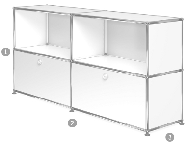 L’architecte Fritz Haller conçu en 1963 le système d’aménagement USM dans le cadre d’un contrat avec la serrurerie et quincaillerie suisse U. Schärer Söhne. Après l’aménagement d’espaces dans les ateliers, il élabora des meubles de bureau pour cette entreprise. USM Haller deviendra ainsi bientôt le classique du design que l’on connait. C’est notamment grâce à la banque Rothschild qui équipa ses bureaux à Paris qu’USM Haller devient populaire. Dès les années 70, ce système de meuble optimisa la culture du travail moderne avec des espaces ouverts et flexibles. USM Haller est un jeu de construction composé de trois éléments : le tube de métal pour la structure, dont les segments sont reliés par de petites boules chromées, et les parois en métal ou en verre. Ce système permet la conception de meuble selon les besoins individuels et offre toujours la possibilité ultérieurement d’être modifié. Ainsi, un USM Sideboard L peut être prolongé sans problème par deux éléments là où l’USM Sideboard XL possède six compartiments. À l’aide d’outils spéciaux, il est possible d’ajouter ou d’enlever des éléments dans toutes les directions et de choisir les ouvertures du meubles. Avec l’USM Haller Sideboard L, choisissez si vous préférez des compartiments qui se tirent avec coulisse ou des portes battantes qui se ferment avec charnières.