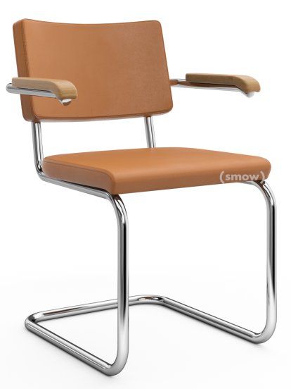 | Matériaux | Piètement: tube d'acier rond chromé Assise et dossier: contreplaqué moussé avec 30 mm de mousse froide moulée Revêtement: cuir nubuck pleine fleur ou cuir nappa naturel, chacun avec surpiqûres contrastées Patins (facultatif): plastique, noir |