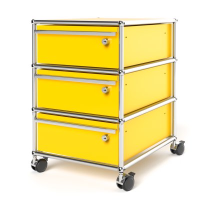 Caisson à roulettes USM Haller avec 3 tiroirs Type 1 , Tous les compartiments avec serrures, Jaune or RAL 1004