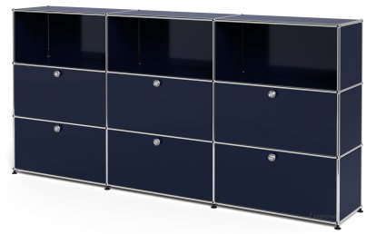 Meuble haut Highboard XL USM Haller, personnalisable, Bleu acier RAL 5011, Ouvert, Avec 3 portes abattantes, Avec 3 portes abattantes