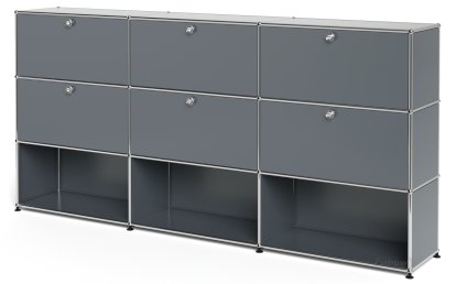 Meuble haut Highboard XL USM Haller, personnalisable, Gris moyen RAL 7005, Avec 3 portes abattantes, Avec 3 portes abattantes, Ouvert