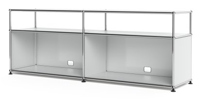 Meuble bas Lowboard L USM Haller avec rehausse, personnalisable, Gris clair RAL 7035, Avec 2 portes abattantes, Avec passe-câbles au centre haut