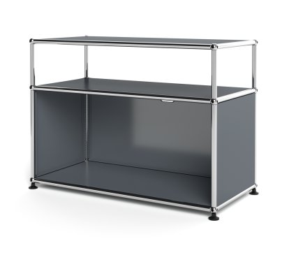 Meuble bas Lowboard M USM Haller avec rehausse, personnalisable, Gris moyen RAL 7005, Avec porte abattante, Avec passe-câbles au centre haut
