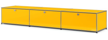 Meuble bas Lowboard XL USM Haller, personnalisable, Jaune or RAL 1004, Avec 3 portes abattantes, 50 cm