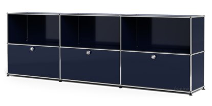 Meuble mixte Sideboard XL USM Haller, personnalisable, Bleu acier RAL 5011, Ouvert, Avec 3 portes abattantes