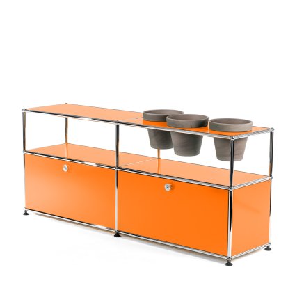 Meuble Sideboard USM Haller pour plantes, Orange pur RAL 2004, Ouvert, Avec 3 pots sur la droite, Terre cuite