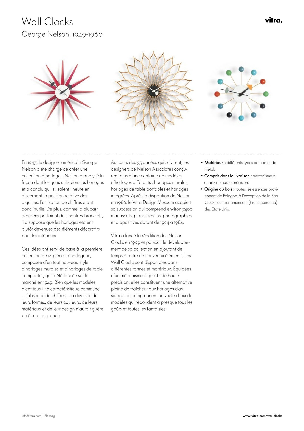 La Miller Clock Compagny arrêta la production des Wallclocks de Nelson. Vitra reprit alors la production en 1990 créant ainsi une Collection Nelson. La plus grande partie de la distribution du mobilier design américain du milieu du siècle en Europe est réalisée par Vitra. Comme les horloges de George Nelson, les idées de Ray & Charles Eames se sont mises en forme avec l’aide du fabricant suisse et sont devenues des classiques du design. L’idéal pour prendre conscience de l’importance du quotidien, est d’ajouter une valeur aux objets du quotidien. Cela dit, Vitra ne souhaite pas uniquement réaliser des classiques du design. Le fabricant de meubles est actif et ouvert quant à la création de nouveaux concepts, matériaux, designs en coopération avec des designers talentueux et contemporains comme Jasper Morrison, Hella Jongerius ou les Bouroullec. C’est pour cela que Vitra documente dans son Musée du design d’importants concepts, de riches et nouvelles influences et rend ce contenu accessible au public.