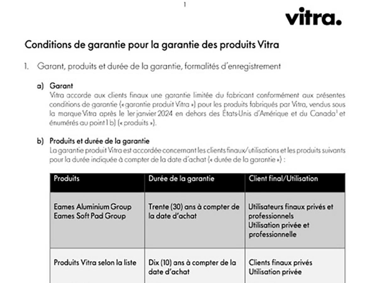 Les normes de qualité les plus élevées permettent à Vitra d'accorder une garantie prolongée du fabricant allant de 10 ans jusqu'à 30 ans sur certains classiques du design. Enregistrez votre meuble Vitra aujourd'hui et bénéficiez de généreux avantages de garantie. Toutes les informations concernant la garantie du fabricant Vitra peuvent être téléchargées via le PDF ci-contre ou sont disponibles directement sur le site de Vitra.